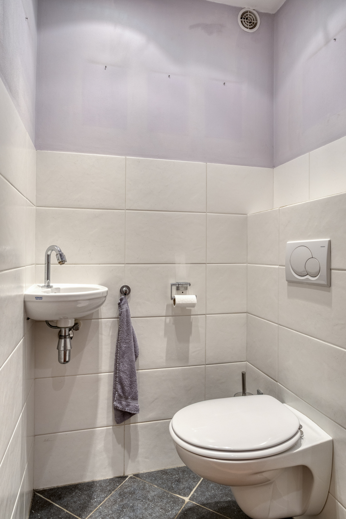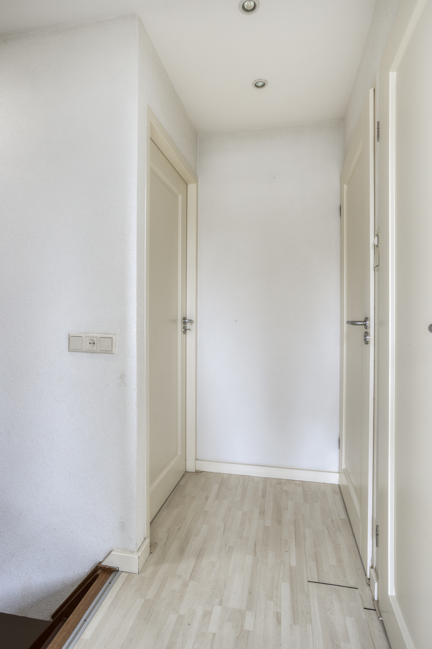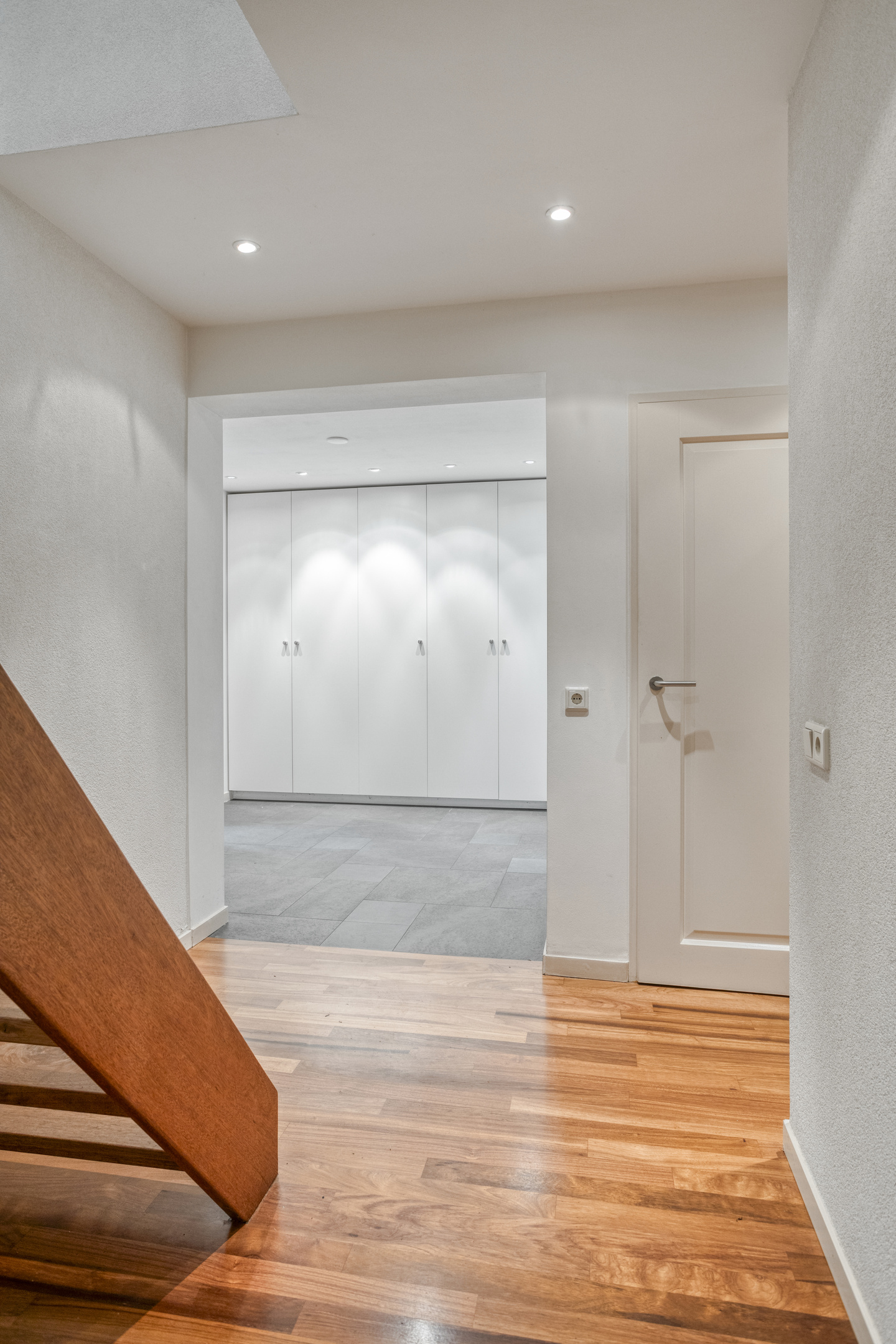 Through the entrance, you reach the hallway of the home. Here you will find a practical wardrobe closet for coats and shoes, the staircase to the first floor, and a toilet with a small sink.