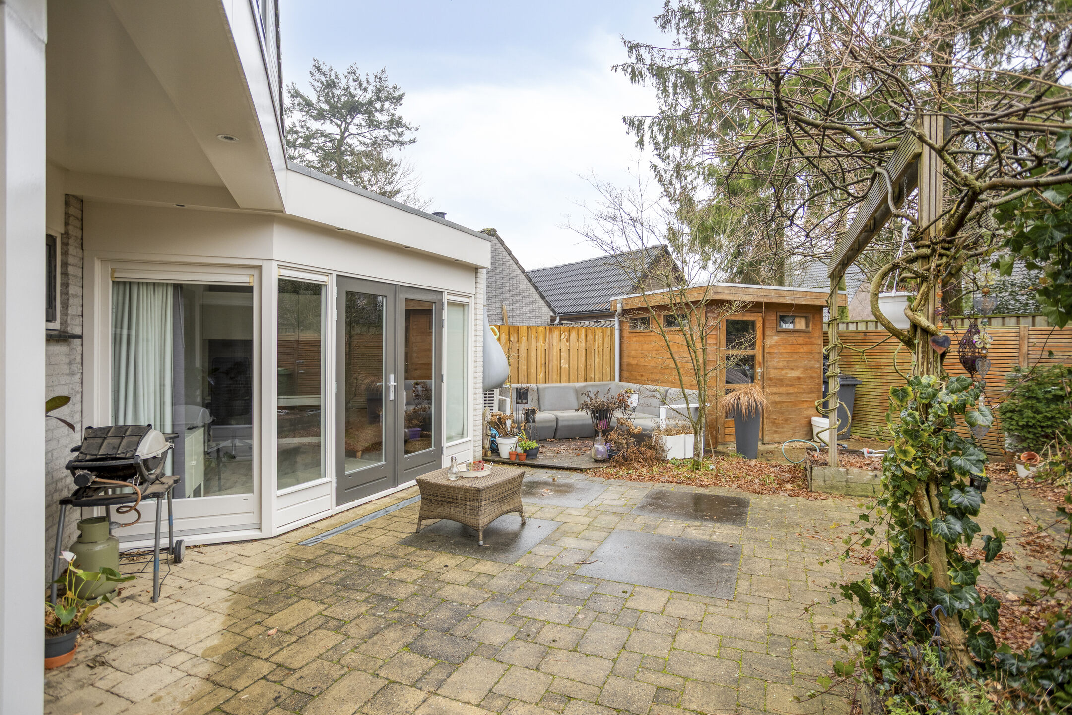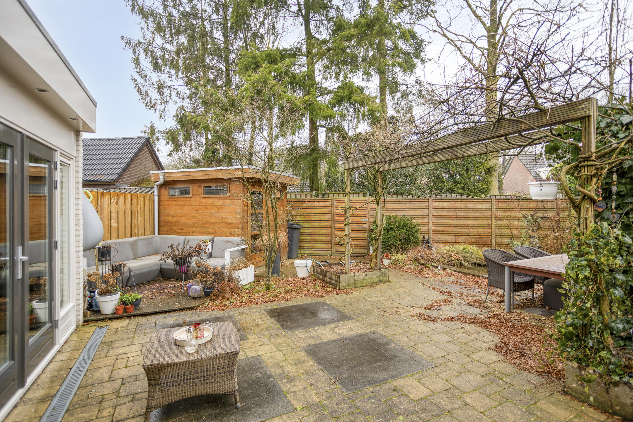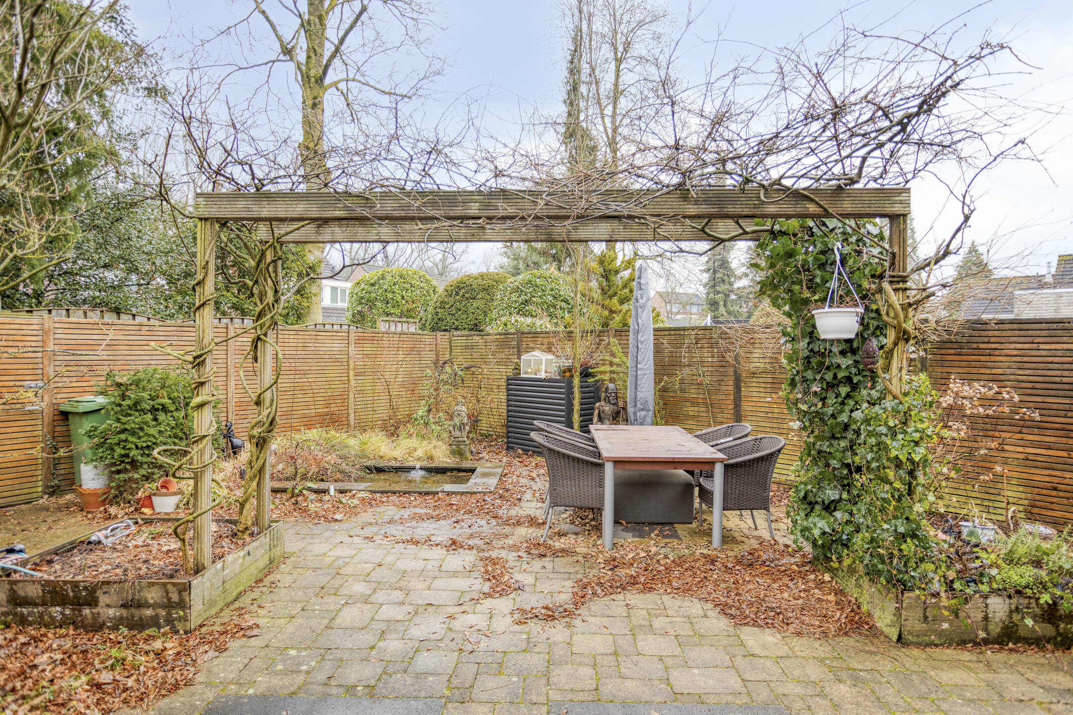 The backyard is southeast-facing, allowing you to enjoy the sun for a large part of the day. The garden also has a rear entrance, which is convenient for bicycles or garden maintenance.
