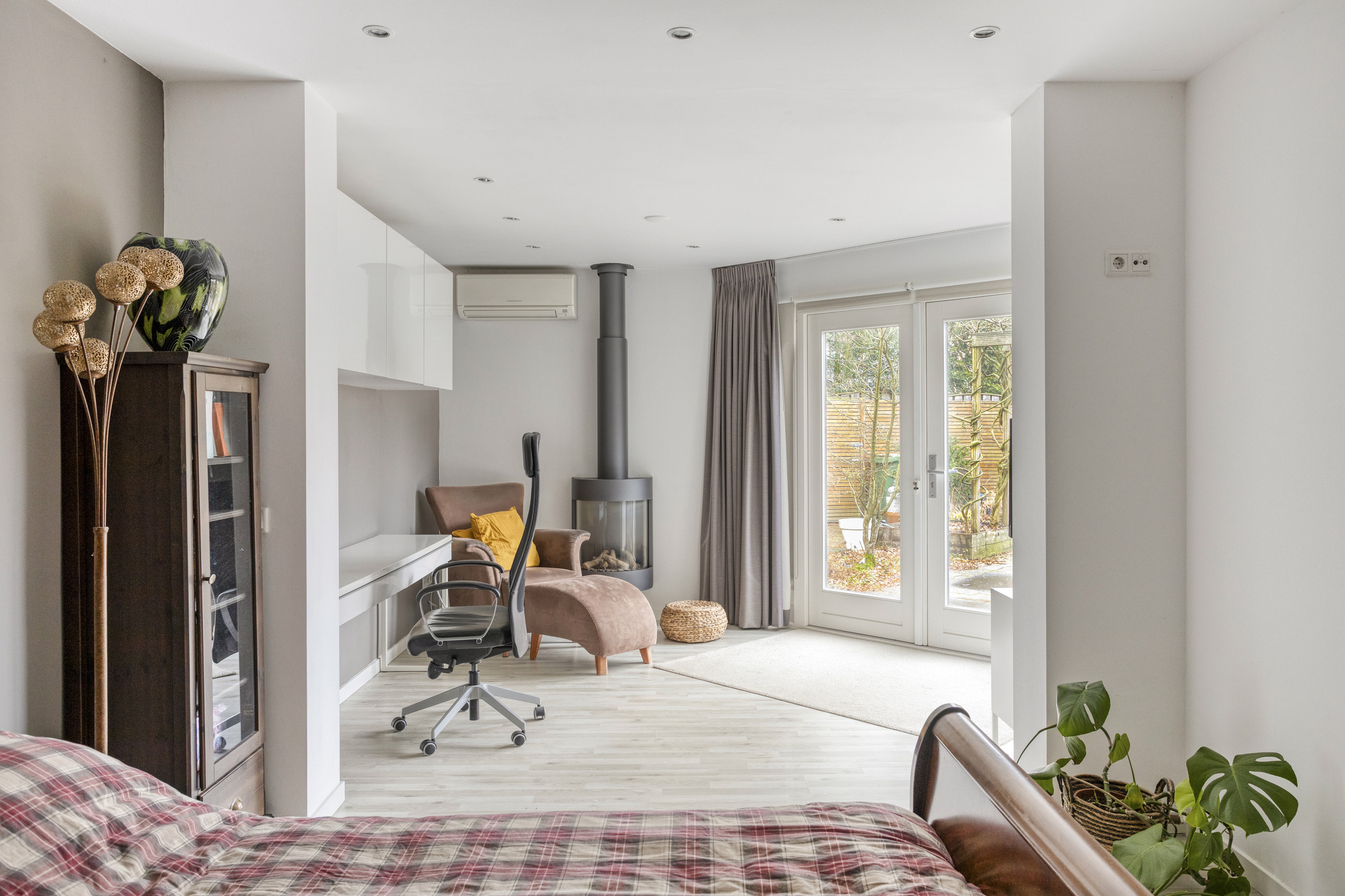 From the hallway, you can access the spacious ground-floor bedroom. This room includes a built-in wardrobe, a private bathroom, and French doors opening to the garden, providing plenty of natural light and a pleasant connection to the outdoors.