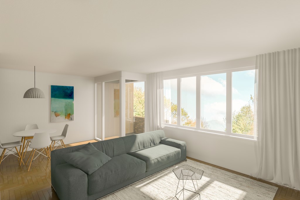 De ruime woonkamer is voorzien van fraaie hout-look vloer. Toegang tot het ruime balkon.