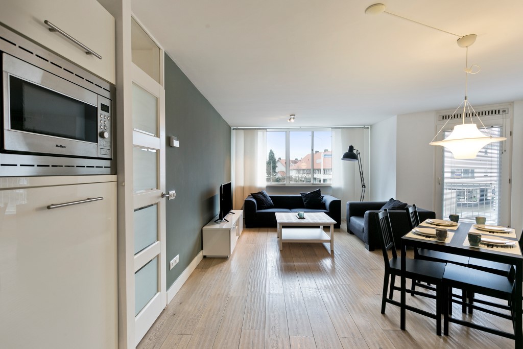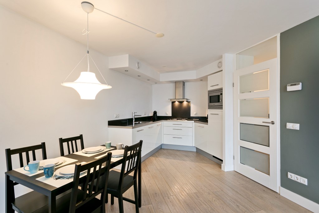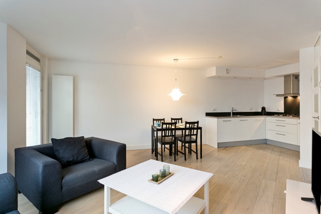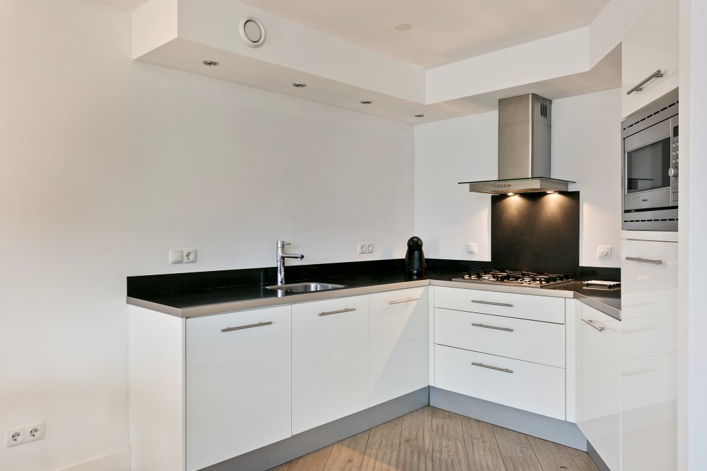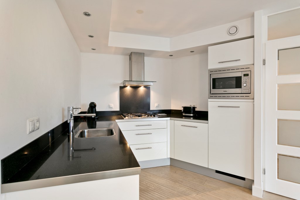 Ruime woonkamer met grote raampartijen. Het appartement heeft een balkon aan de voorzijde. Aansluitend aan de woonkamer is een open keuken te vinden. Deze is uitgerust met een 4- pitsgaskookplaat, afzuigkap, koelkast, vriezer, vaatwasser, combi-magnetron/oven en voldoende opbergruimte.