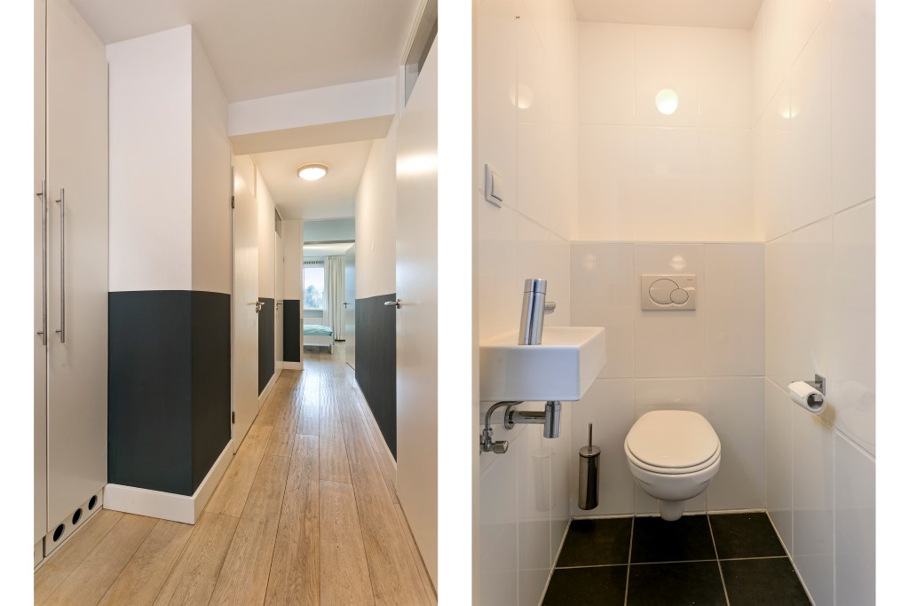 Entree met eikenhoutenvloer. Vanuit de hal bereikt men de woonkamer, slaapkamer en de badkamer