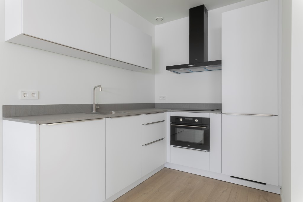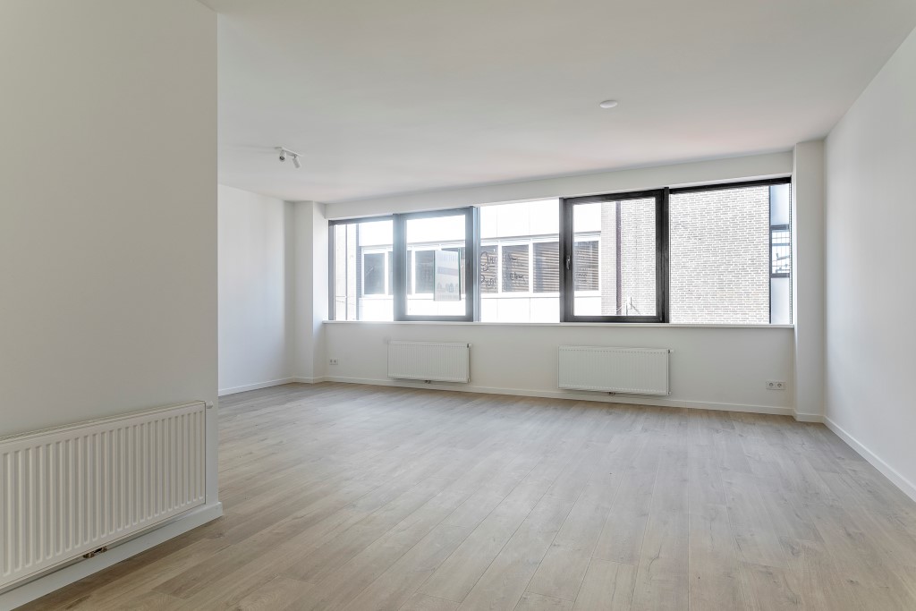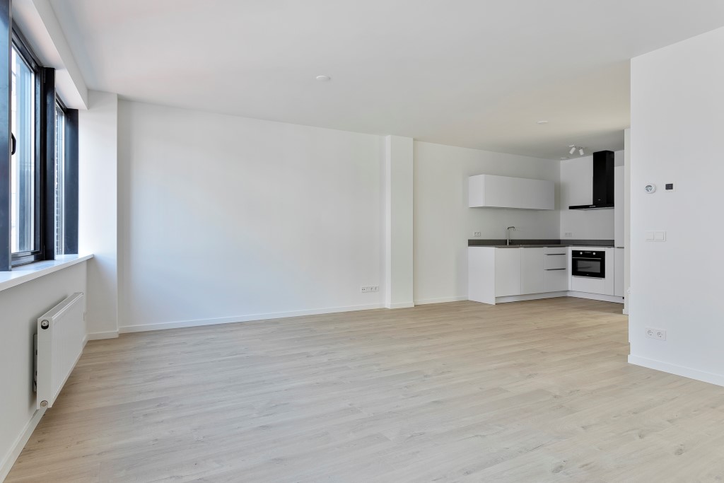 De lichte woonkamer ligt aan de straatzijde en kenmerkt zich door de grote raampartijen, waardoor er veel natuurlijk licht binnenvalt. De open keuken is modern uitgevoerd en voorzien van diverse inbouwapparatuur, waaronder een koelkast, combi-magnetron/oven en een vaatwasser<br
