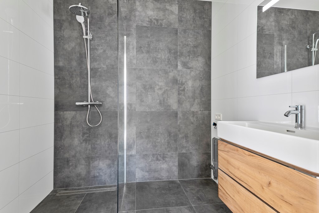 De badkamer is praktisch ingericht en beschikt over een douche, wastafelmeubel en aansluiting voor een wasmachine.