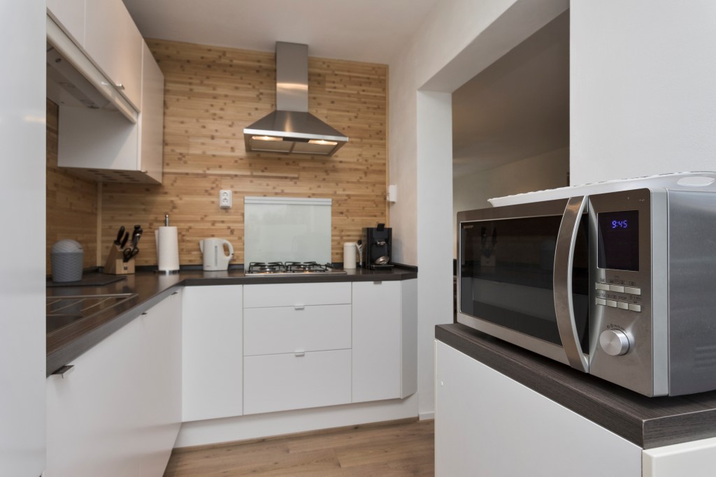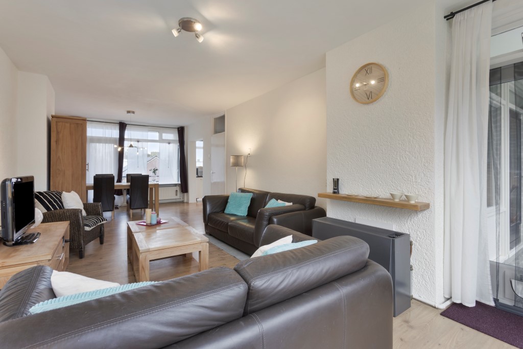 De semi- open keuken is voorzien van een, koelkast, diepvries, gaskookplaat met afzuigkap, combi-oven/magnetron en voldoende bergruimte.