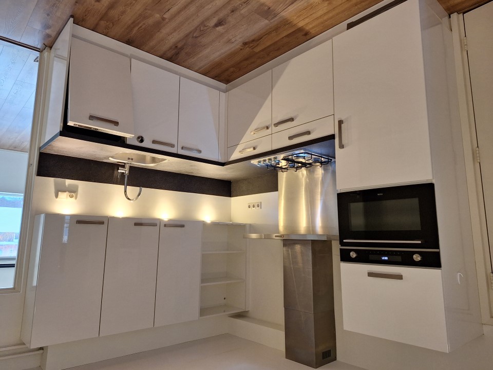 De open keuken is voorzien van inbouwapparatuur, waaronder een kookplaat, afzuigkap, combi magnetron/oven en koelkast, en biedt voldoende kastruimte voor dagelijks gebruik.