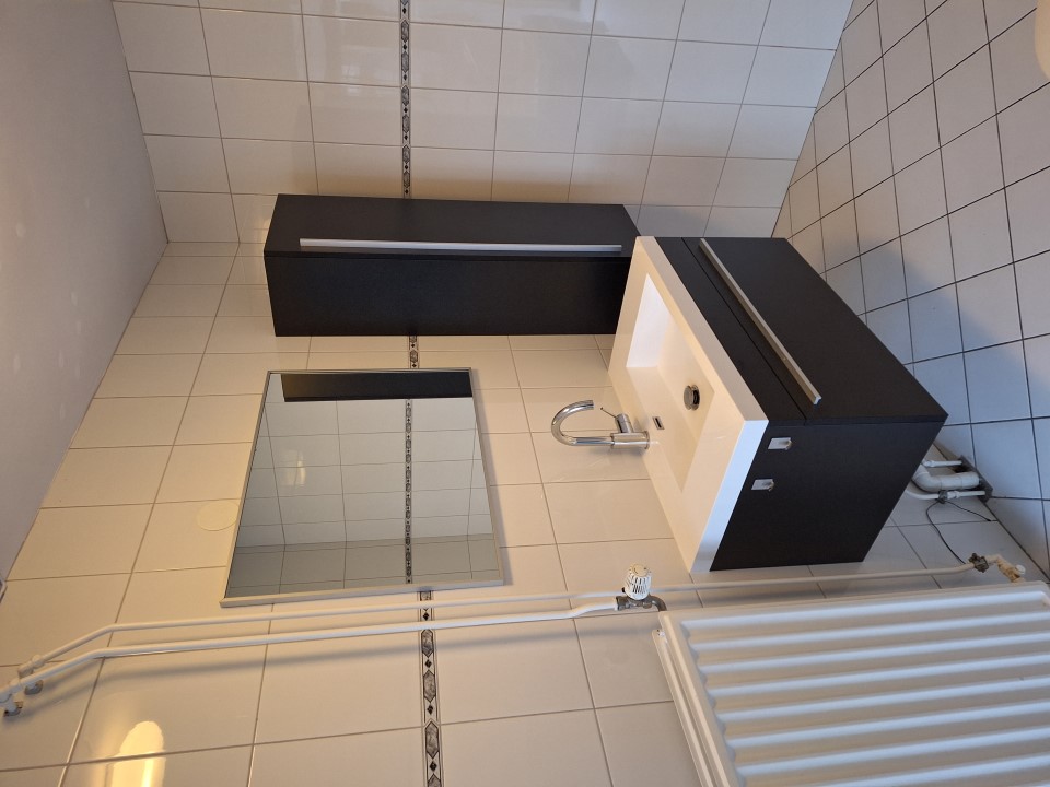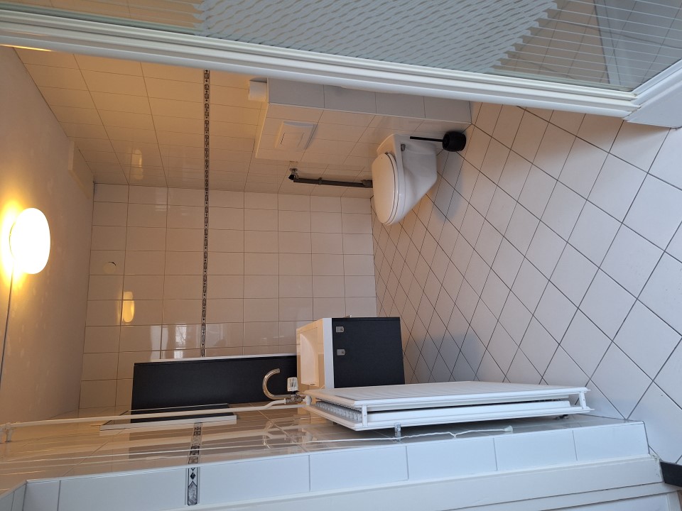 De badkamer is volledig betegeld en uitgerust met een douche, wastafel en toilet. Aansluitingen voor was apparatuur zijn aanwezig.
