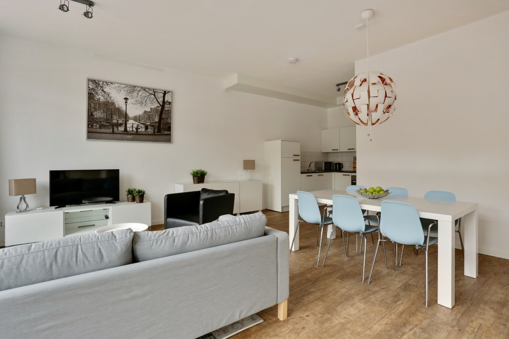 Veel lichtinval door de grote ramen aan de. De woonkamer is ingericht met een gezellige zithoek met bank, hocker, fauteuil, dressoirkast en een TV dressoir met een grote flat screen smart TV, een aparte werkplek met uitzicht op de Markt en een ruime eettafel met 6 stoelen.