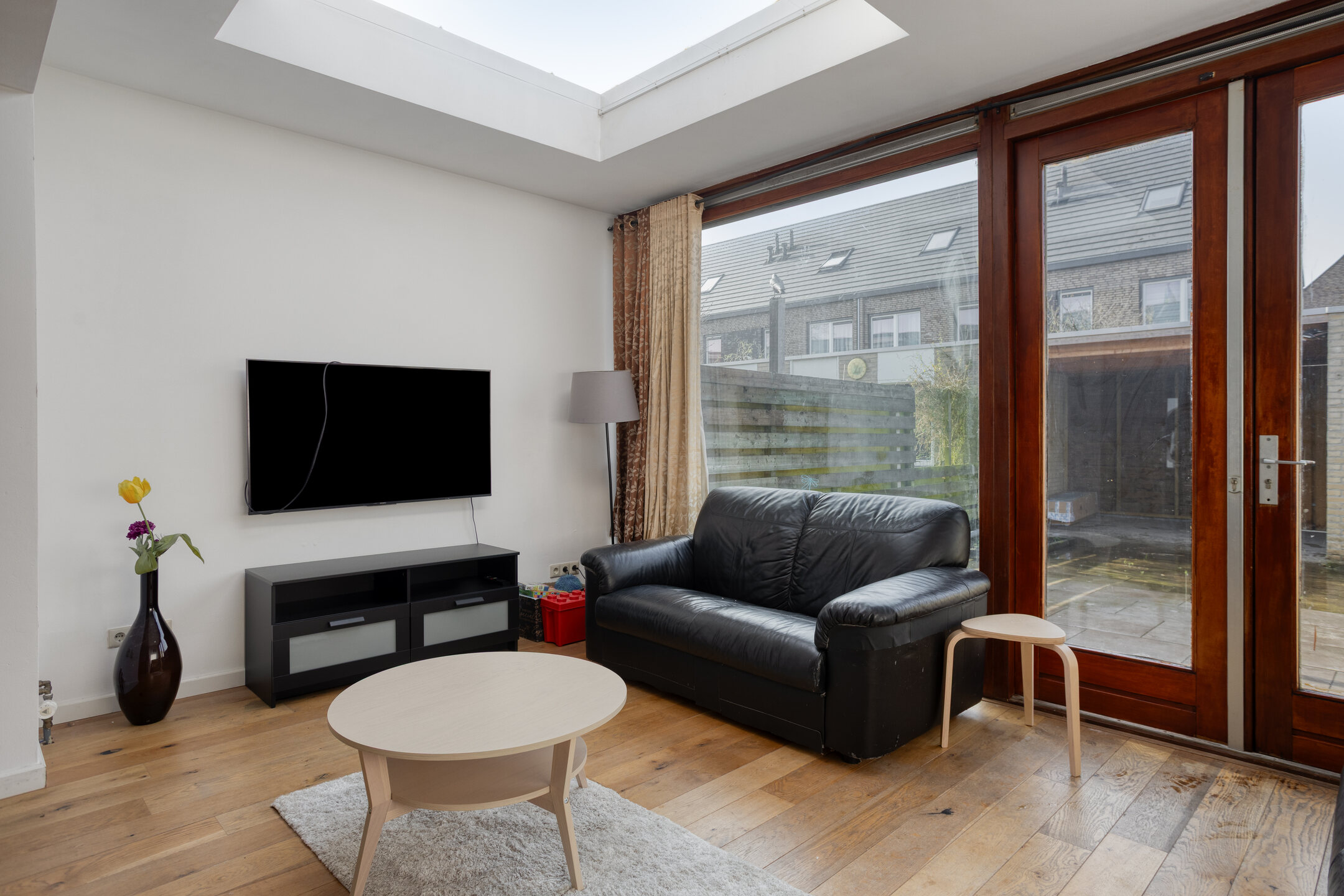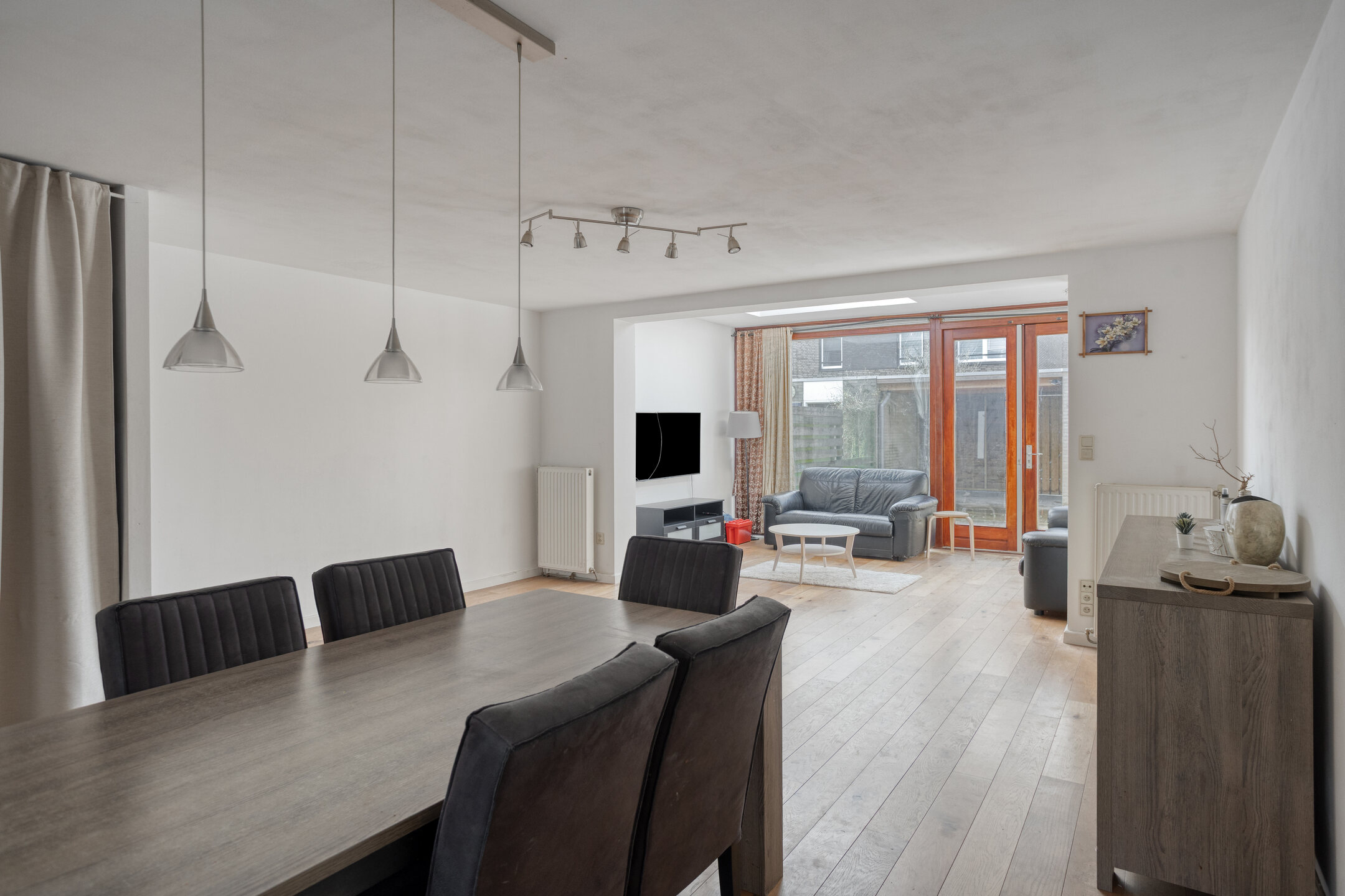 De ruime woonkamer is volledig ingericht en biedt een comfortabele leefruimte. Door de uitbouw met lichtstraat valt er veel natuurlijk licht naar binnen, wat zorgt voor een prettige en open sfeer.