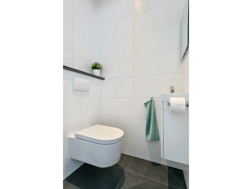 De badkamer is voorzien van ruime inloopdouche, designradiator, wastafel en toilet.