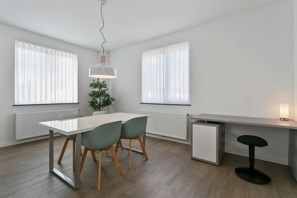 Apart bureau in de woonkamer. Open nieuwe keuken voorzien van alle benodigde inventaris en voorzien van gaskookplaat, combi-oven-magnetron, vaatwasser, koelkast en vriezer.