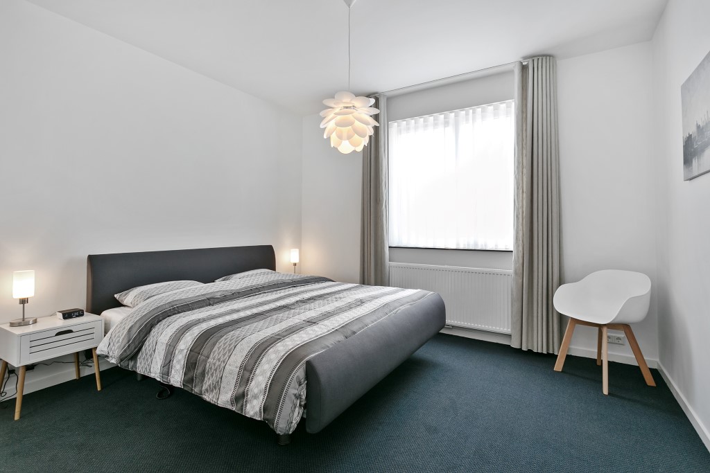 Slaapkamer voorzien van hoogwaardige matrassen, tapijtvloer, 2-persoons bed en garderobekast.
