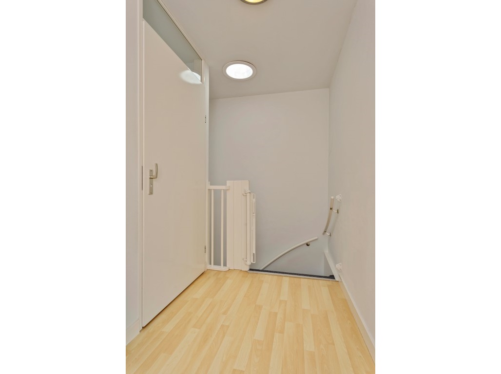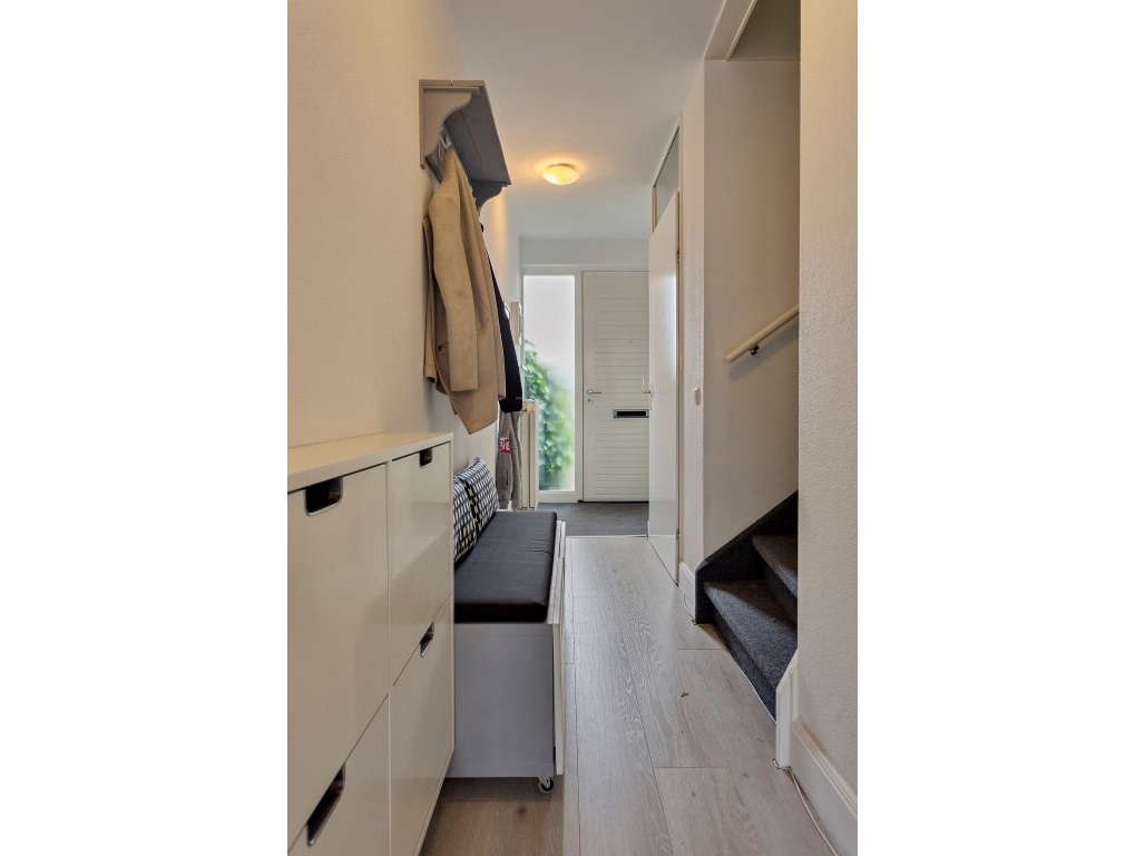 De gehele begane grond is voorzien van een laminaatvloer. Via de hal heeft u toegang tot het moderne toilet, meterkast, opgang naar de eerste verdieping.