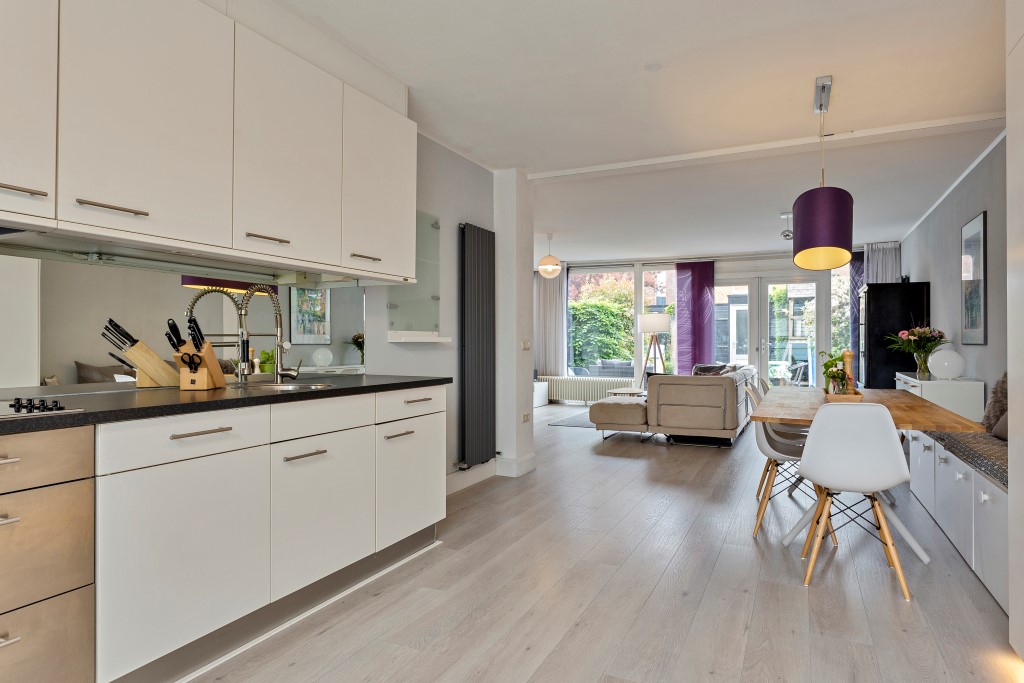 De woonkamer is voorzien van veel daglicht en gaat over in de moderne leefkeuken/eetkamer. Via de woonkamer toegang tot de onderhoudsvriendelijke tuin.