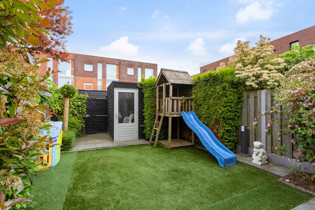 Een fijne onderhoudsvriendelijke tuin met een berging. Via de tuin toegang tot de parkeerplaatsen.